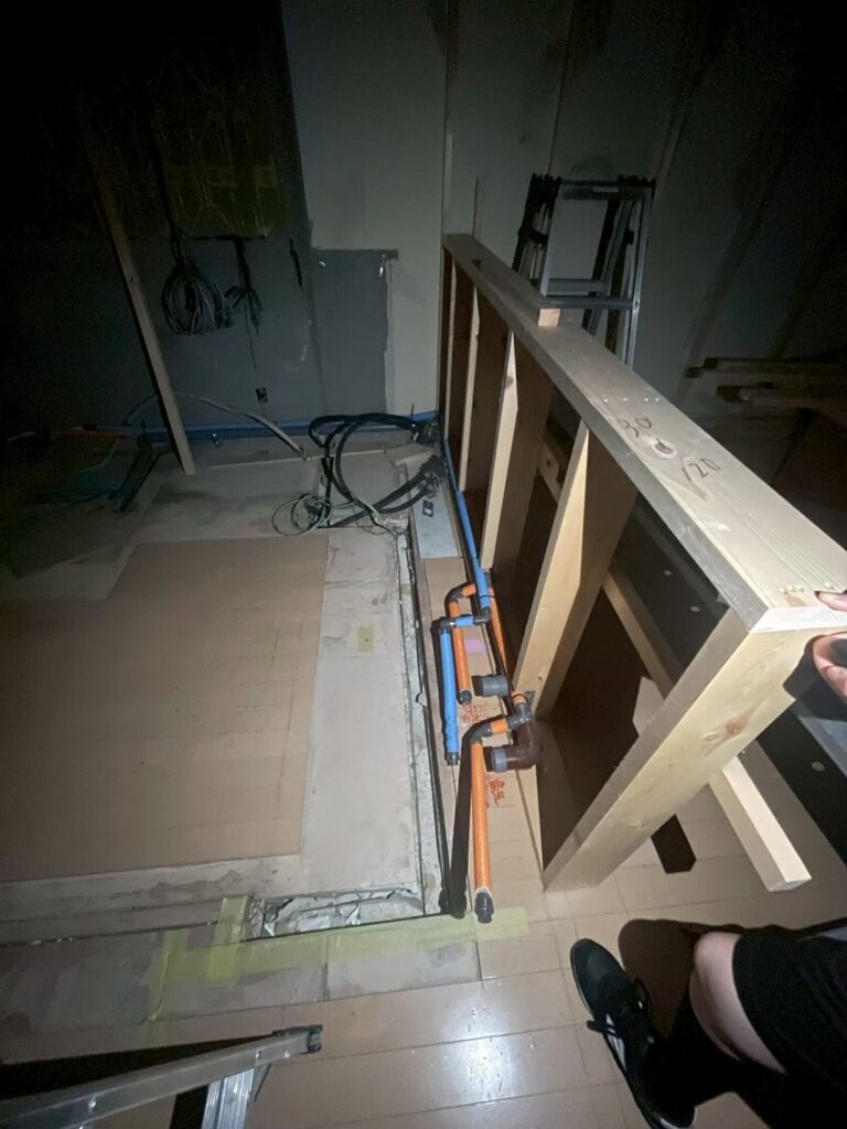 ・厚み(20cm) バーカウンターのように分厚くしたかったものの、床下まで迫る既存の床暖房パネルが干渉し、20cmが限界でした。