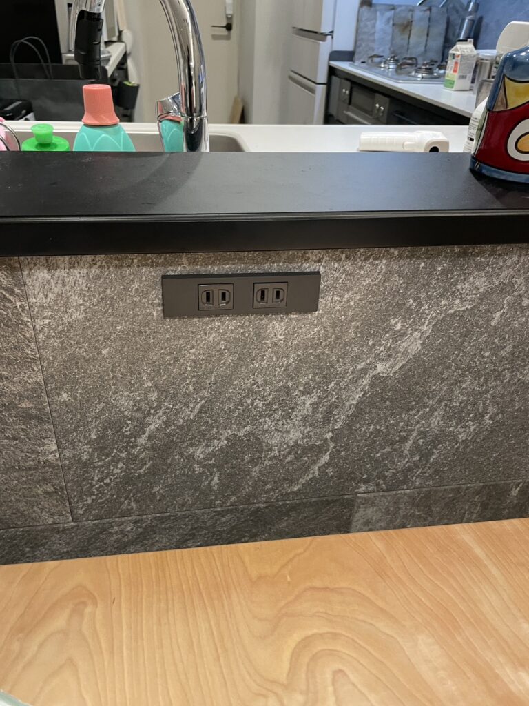 ダイニングテーブルの横の壁(キッチンの腰壁)にも電源を配置。これは大活躍。