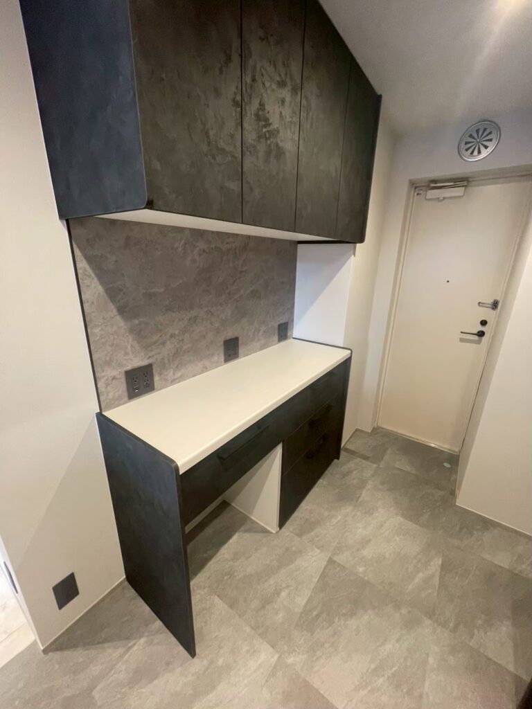 仕事部屋として使う5畳の洋室には、デスクを置く位置に合わせて高さ1.1mの位置にコンセントを新設しました。 通常、コンセントは床付近(高さ25cm程度)ですが、デスクの上のPCやモニターの電源を取るために、わざわざ机の下に潜り込むのは非合理的です。 「個人の趣味(用途)に寄りすぎでは?」と少し迷いましたが、5畳の部屋のコンセント位置がちょっと高いからといって資産価値が落ちることはないだろうと判断し、機能性を最優先しました。