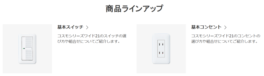 リフォームにおいて、当初、こちらが無知で特に指定をしなかったので、業者側の標準仕様としてパナソニックの「コスモシリーズワイド21」が見積もりに入っていました。(少し丸みのある、ツヤのある白いプレート。賃貸物件などでよく見る定番の形です)
